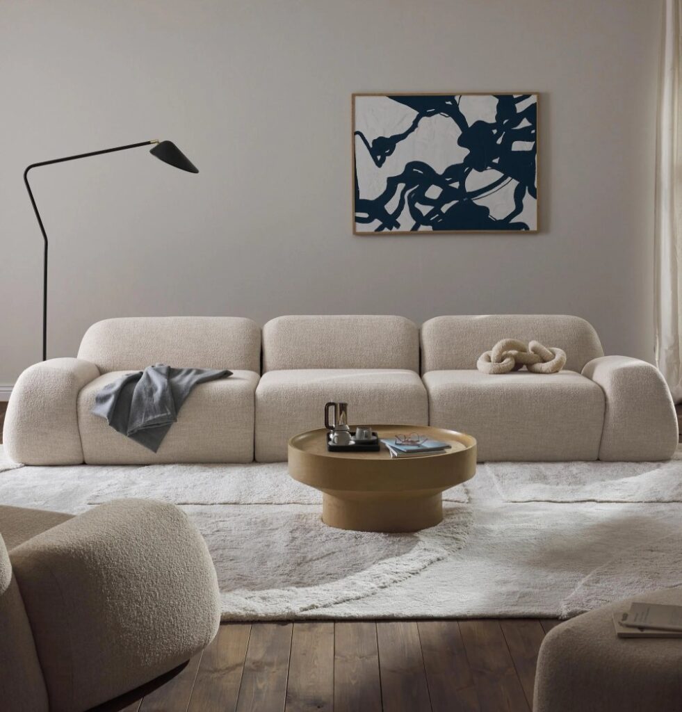 Canapé modulable en bouclette Lena, très tendance par sa modularité, son volume et les coloris proposés. Source photo : Westwing