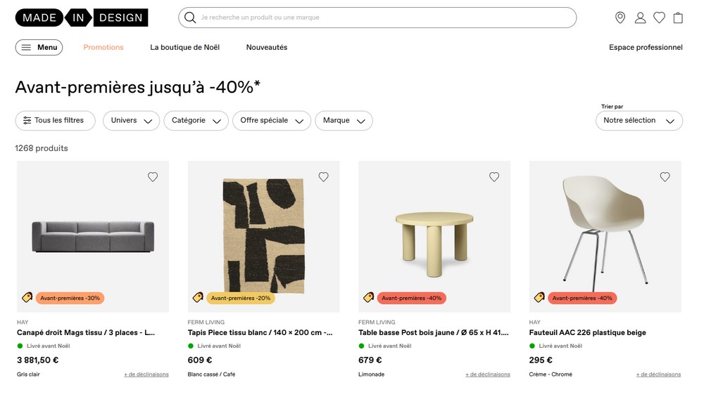 Envie de profiter des ventes privées d’hiver de décembre 2025 pour vous faire plaisir avec un beau meuble de marque de designer ou de la décoration haut de gamme ? Made in design, site spécialisé dans le mobilier contemporain haut de gamme / luxe lance dès cette fin décembre ses ventes privées (nommées Avant-premières), avec jusqu’à – 40 % sur de très nombreux produits, meubles et déco d’intérieur comme d’extérieur.