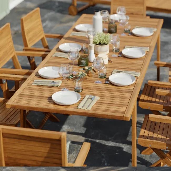 Le bois a plusieurs avantages lorsqu’il est utilisé sur du mobilier de jardin dont la table à manger d’extérieur : il est naturel et s’intègre bien dans l’environnement extérieur, sans dénaturer. Chaleureux, il est chic, élégant et apporte aussi une touche de charme à une terrasse en pierre ou carrelage par exemple. Il convient à de nombreux styles de décoration d’extérieur, aussi bien bord de mer, que bohème, que scandinave, moderne, contemporain ou plus rétro. Solide, durable, il pourra durer des années à condition d’être bien entretenu.