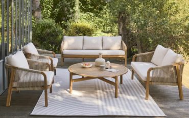 Autre salon de jardin phare du catalogue sweeek, le modèle Ushuaïa en bois d’acacia offre 4 places assises. Il plait par l’aspect lounge de son canapé et de ses fauteuils mais aussi par les nombreux coloris de coussins : écru, vert de gris, terracotta, gris, bleu canard ou beige. Là encore, plus de 200 avis clients attestent de la qualité et de la simplicité de montage de ce salon vendu 399,99 €.