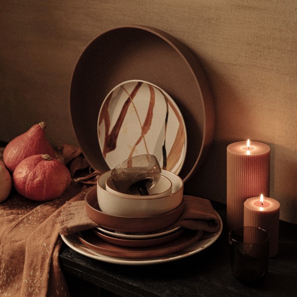 Côté vaisselle, privilégiez des couleurs mates et chaudes : blanc cassé, brun, ocre, terracotta ou encore orange brûlé. Ajoutez quelques branches séchées dans un vase (comme des hortensias ou du feuillage d’automne) pour compléter l’atmosphère.