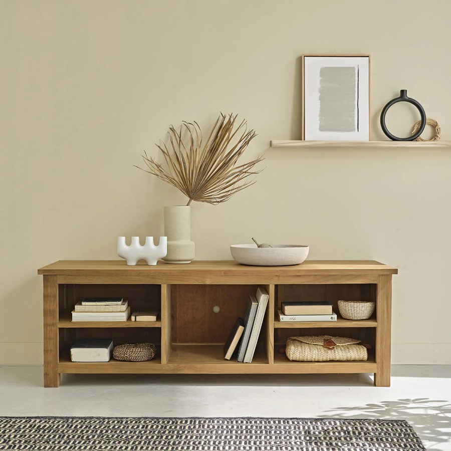 Parfait pour un salon bord de mer, japandi ou même campagne chic, le meuble TV en teck massif Boston est en promo de 31 %. On aime son style brut et minimaliste à la fois.