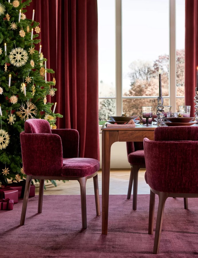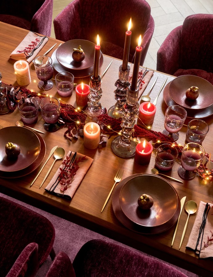 Une table conviviale pour les fêtes dans les tons bordeaux pour Noël 2025. Source photo : La Redoute.