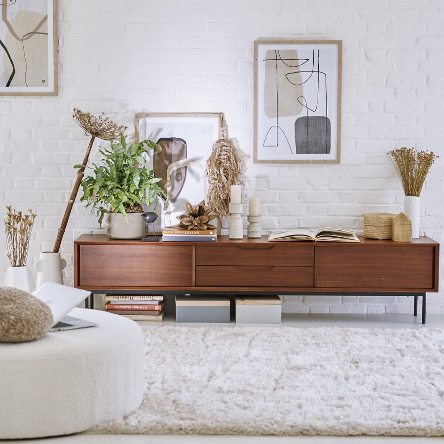 Meuble TV rangement plaqué noyer, Noyeto, – 35 % pour poser votre écran télé dessus ou placer sous un écran fixé au mur.