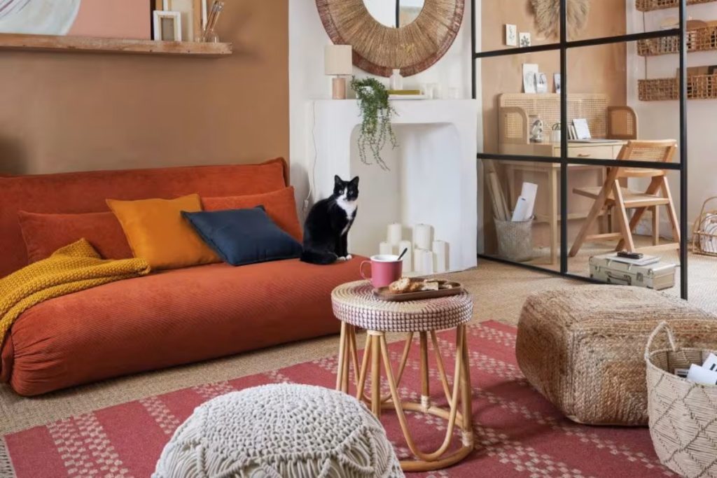 Canapé convertible 2 places Hallen, en velours côtelé vert, écureuil… son design original, au ras du sol, avec un couchage qui se déplie en fait l’un des best-sellers de la marque. Idéal pour les petits espaces. Source photo : Maisons du Monde