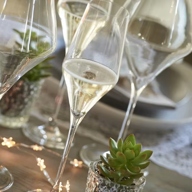 La flûte à champagne en revanche, avec sa forme haute et allongée, permet une meilleure prise en main et de conserver les bulles et arômes plus longtemps, bien que son étroitesse ne permet pas toujours une dégustation confortable. Préférée par le grand public, elle se retrouve sur de nombreuses tables de fêtes.