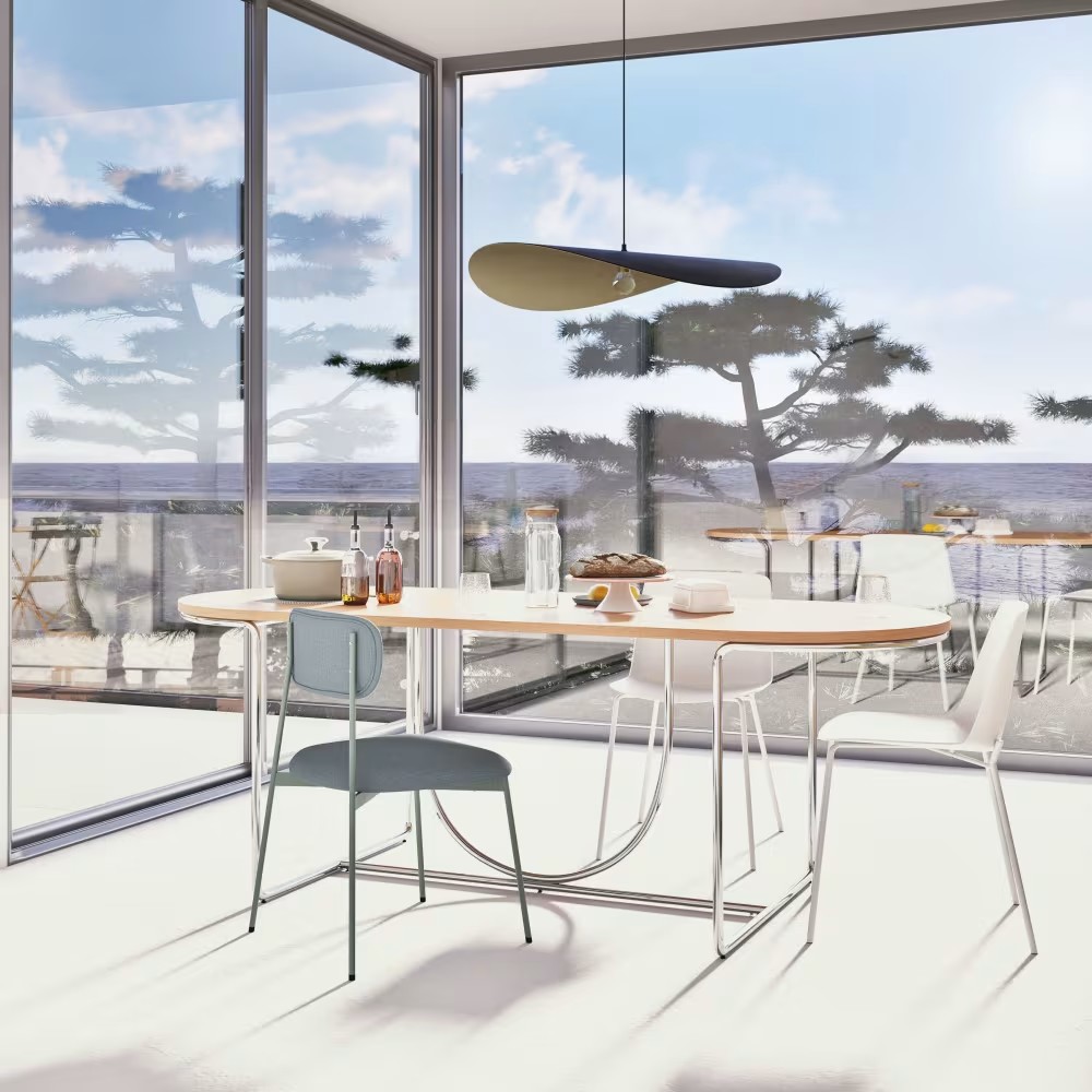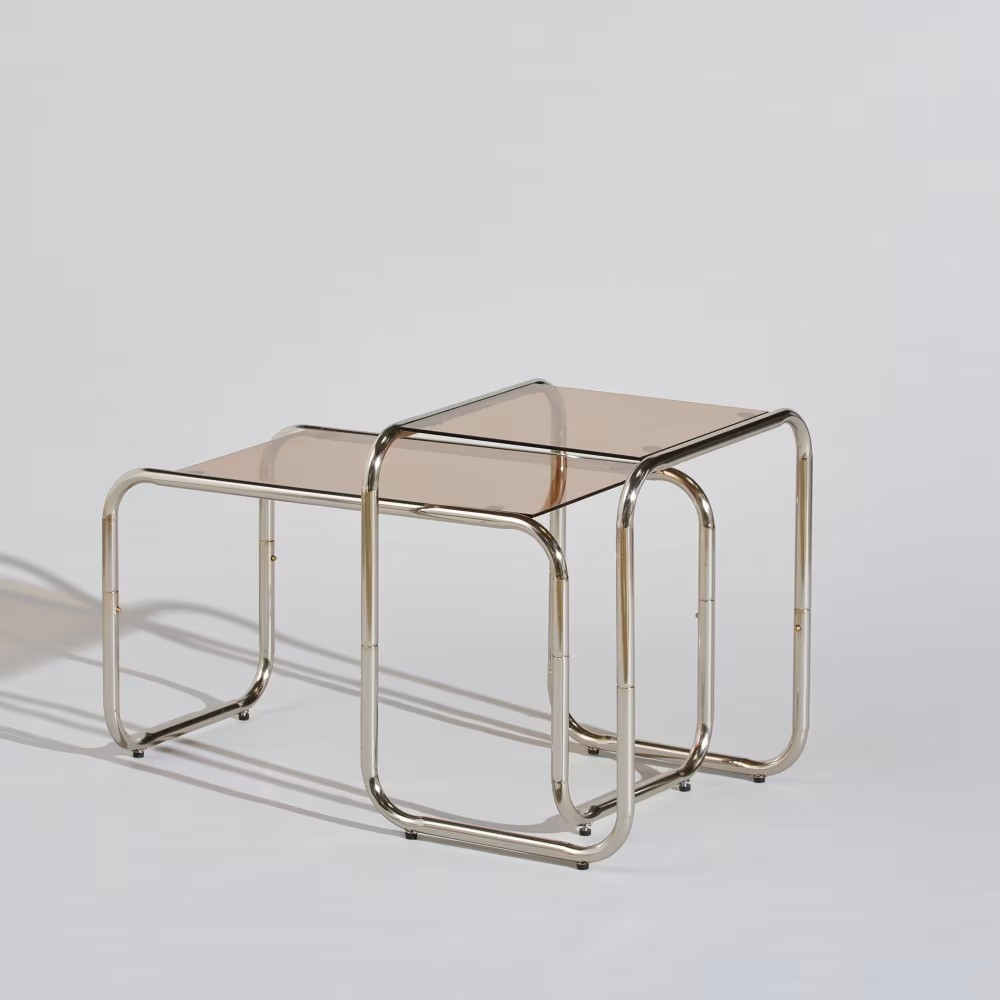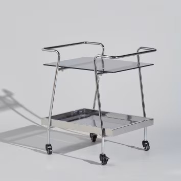 Place à la tendance vintage revisité, avec des meubles en structure tubulaire chromée alliées à des plateaux en verre, mais aussi en bois.