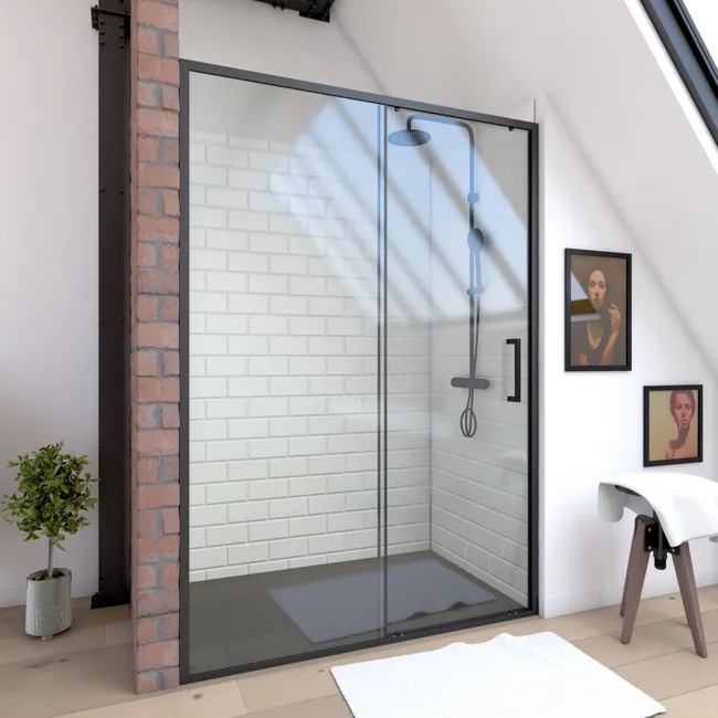 La paroi de douche 120 cm aux profilés noirs avec porte coulissante Factory fait partie des produits remisés de 10 %.