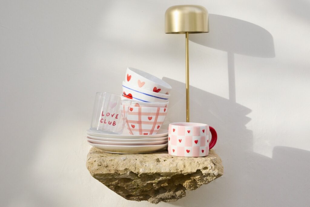 Pour cette édition 2026, Maisons du Monde mise sur les petits objets qui accompagnent les moments simples : un café partagé, un dîner à deux, une pause au bureau ou une table joliment dressée pour le 14 février. La collection se compose de tasses, gobelets, bougies, sets de table, planches à découper ou encore accessoires pour animaux, tous habillés de motifs cœur et de messages délicats comme « Mon amour » ou « Love Club ».