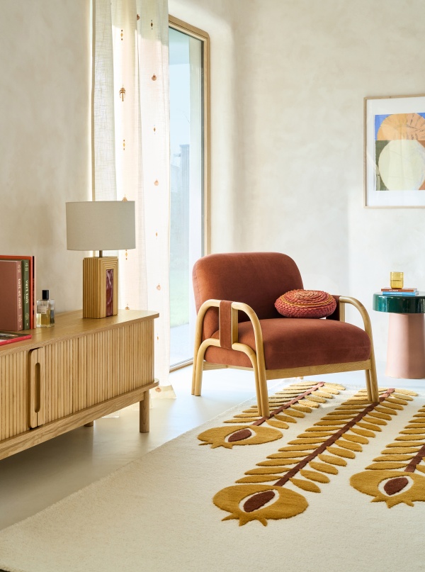Buffet Madara ; Lampe à poser Acia ; Tapis en jute Ikat ; Bougeoir en céramique Foema