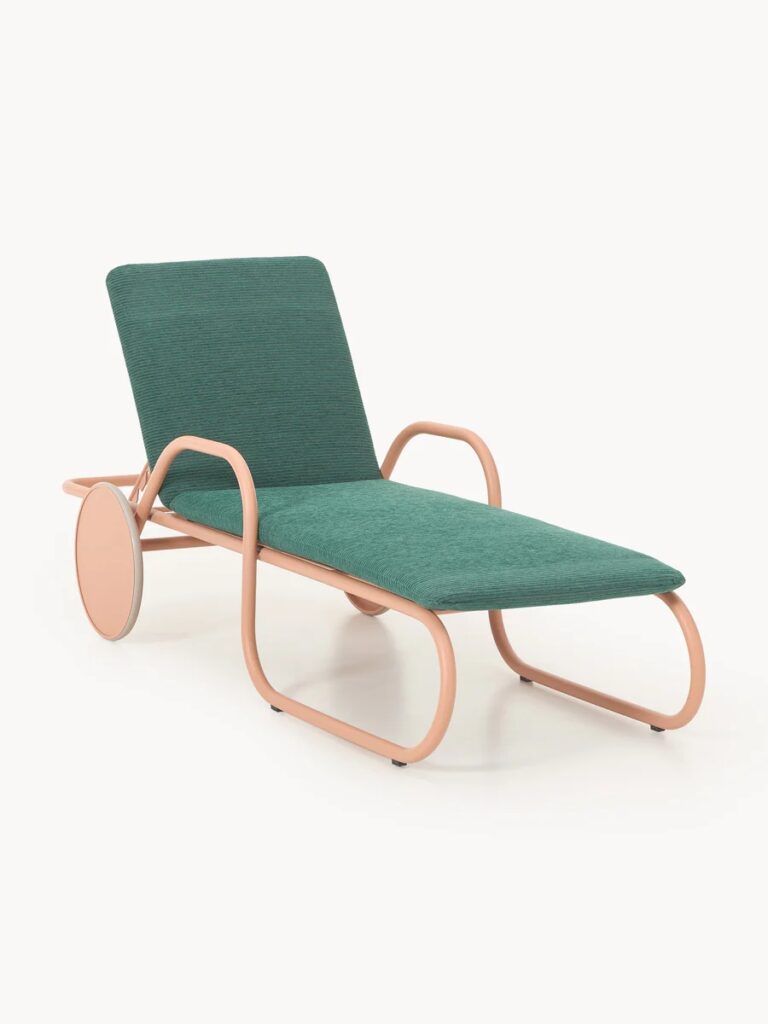 Autre incontournable inspirée du design italien des années 1970 : la collection Caio, avec canapé, salon de jardin et bain de soleil en aluminium blanc, vert ou terracotta