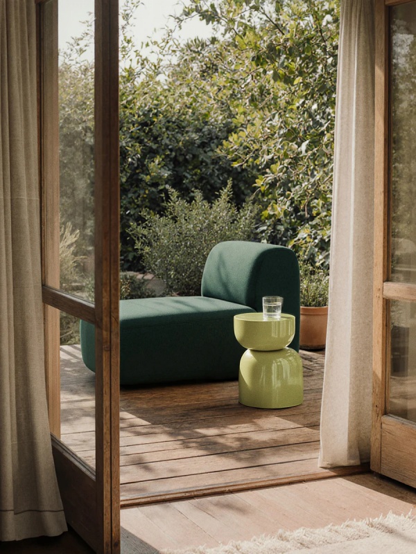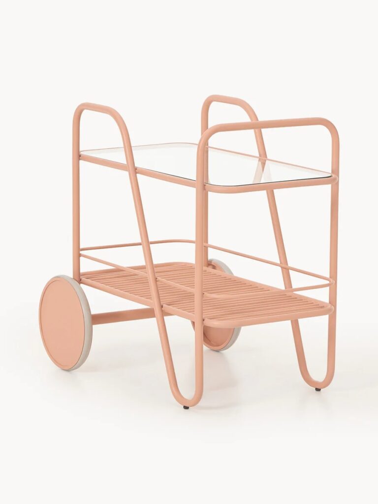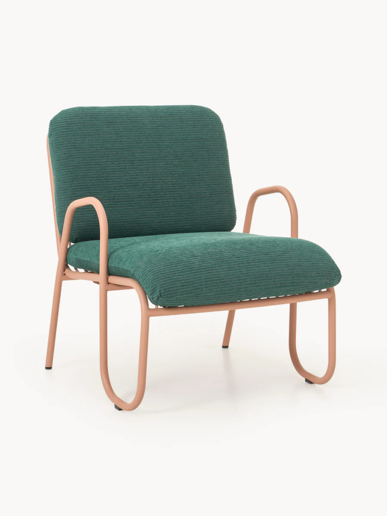 Inspirée de la dolce vita italienne, le fauteuil, le bain de soleil, la table de jardin ou encore la desserte Giovanni transforment la terrasse en véritable coin de bistrot chic. Le jeu de fines rayures apporte relief et caractère avec discrétion, pour une élégance contemporaine jamais ostentatoire. Habillée d’un vert profond sur une structure couleur pêche en acier, elle associe style et durabilité grâce à un tissu résistant pensé pour un usage quotidien.