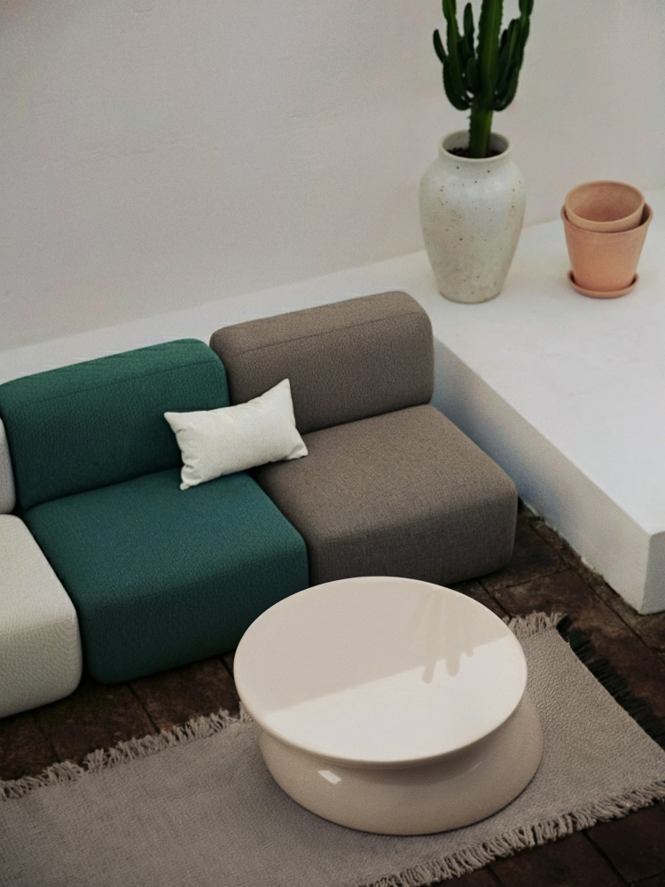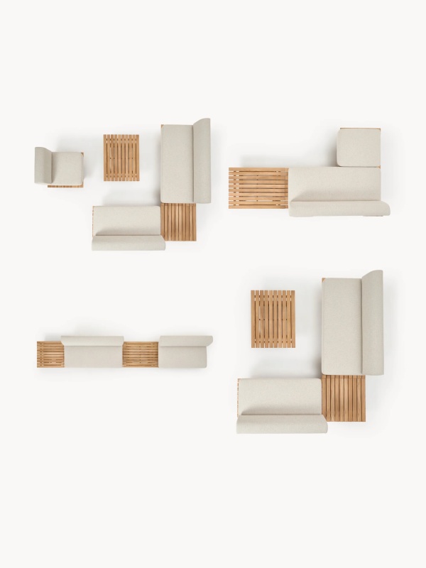 Le canapé modulable en tissu NAOMI mise sur la simplicité des formes pour installer une ambiance apaisée en extérieur. Méridienne, modules ou pouf sans accoudoirs composent un ensemble libre, à organiser selon les moments de la journée plutôt qu’autour d’une disposition figée.