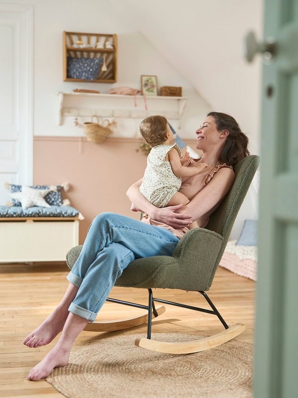 Autre utilisation du rocking-chair : le fauteuil à bascule peut servir à bercer bébé ou le nourrir. Ce type de fauteuil a souvent des accoudoirs et un dossier haut, pour le confort du dos des parents.
