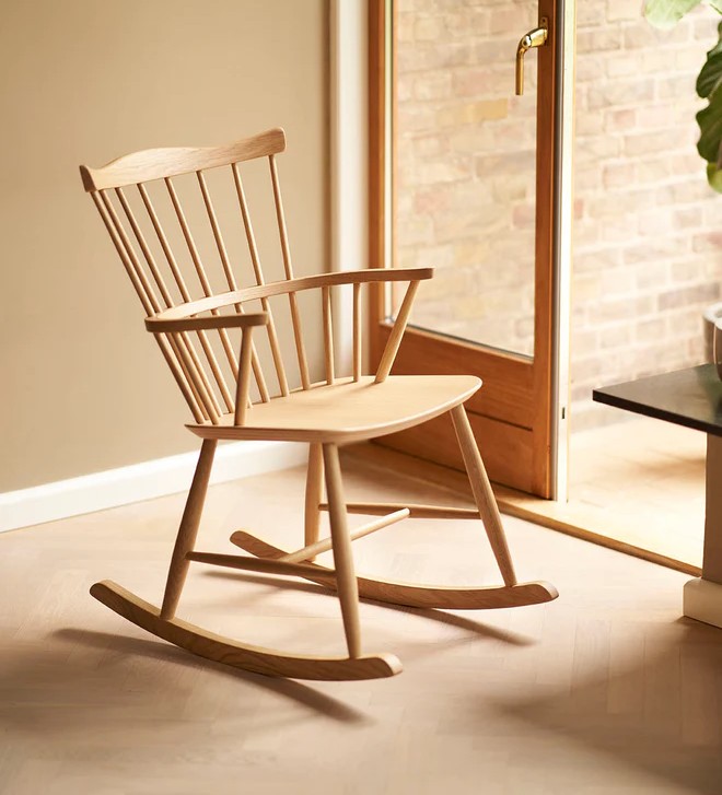Dans un design purement bois et un peu rétro, ce fauteuil à bascule J52G imaginé par Børge Mogensen en 1952. Inspiré par la chaise Windsor anglaise, cette réinterprétation dans un style danois offre du confort avec un minimum de métariaux.