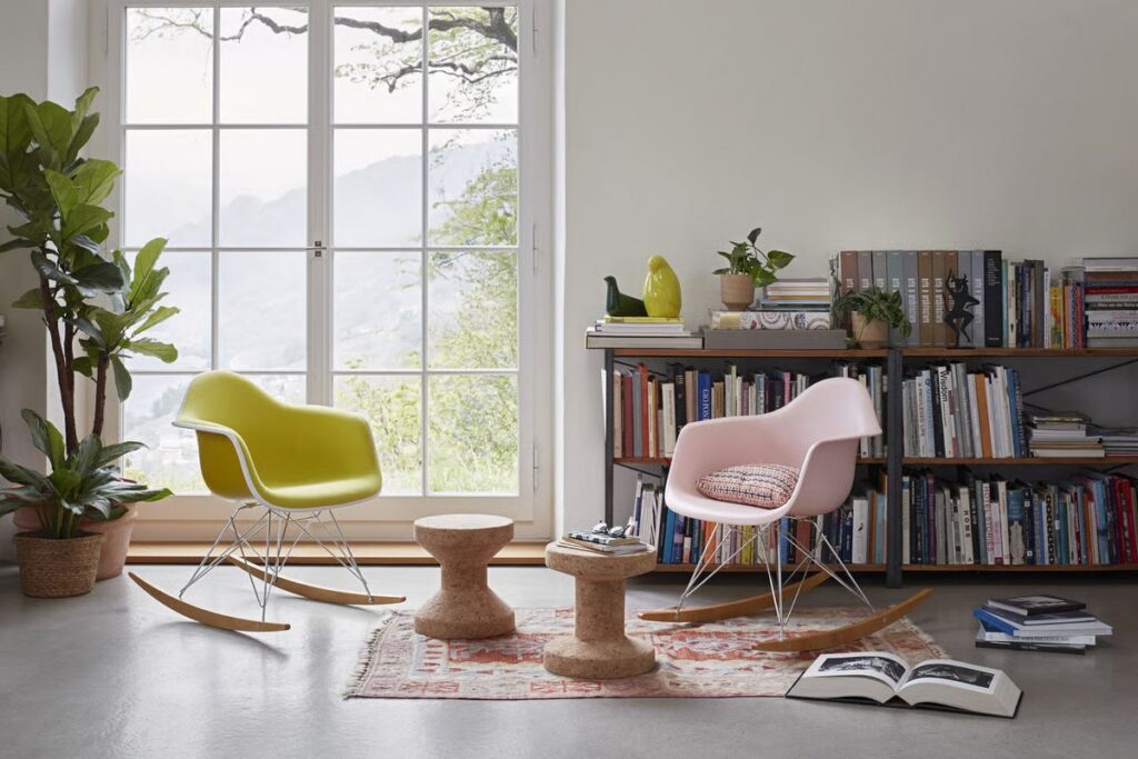 Un rocking chair bien choisi devient rapidement la pièce phare de la pièce. Placé près d’une bibliothèque, accompagné d’un tapis moelleux et d’un plaid, il structure un véritable coin cosy.
