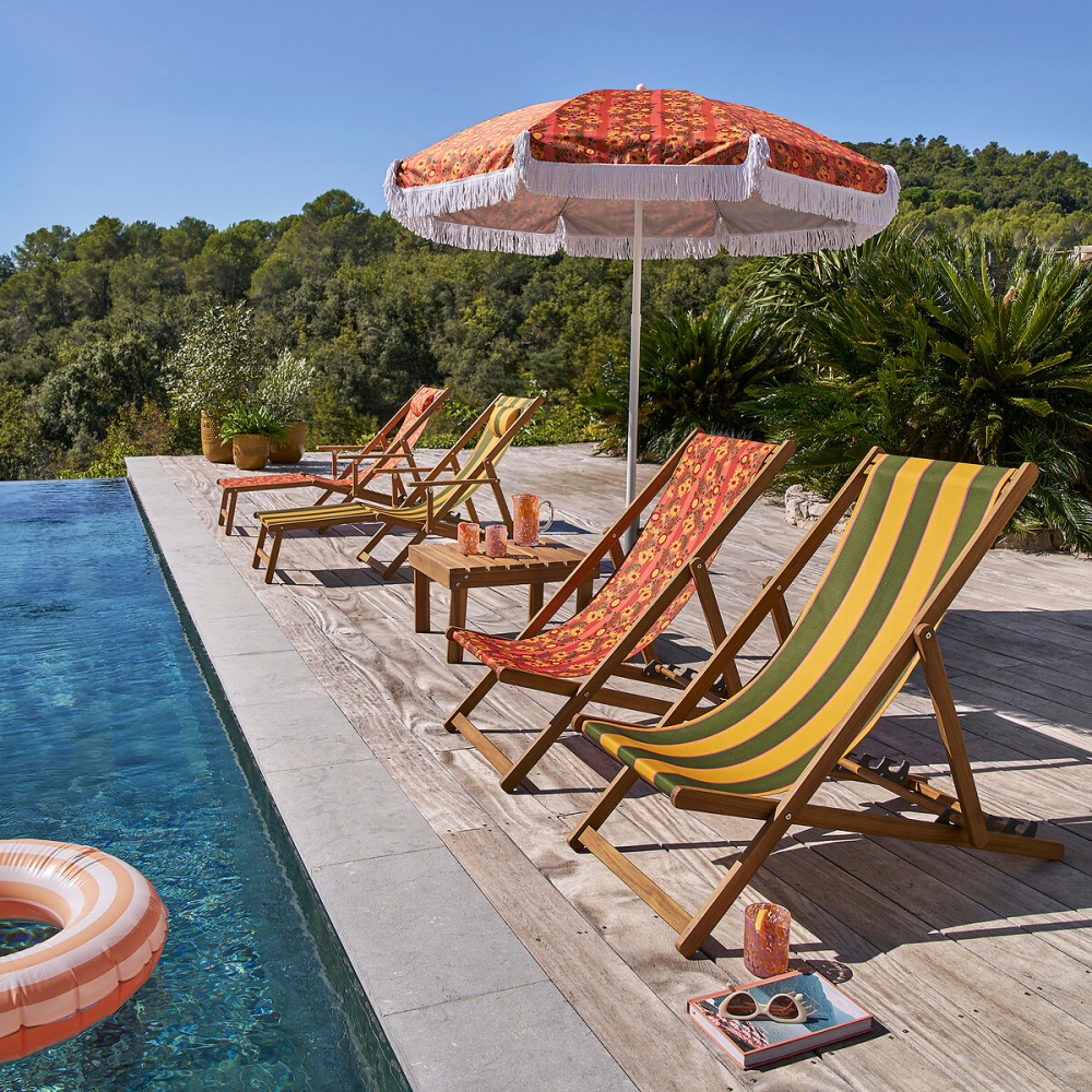 Les chiliennes imprimées iconiques, signature de La Redoute Intérieurs, participent également à cette ambiance estivale. Leurs motifs exclusifs et leurs couleurs vibrantes apportent instantanément une touche de vacances sur un balcon ou une terrasse. Dans le même esprit, les parasols aux motifs originaux (léopard, fleurs, rayures…) à franges apporteront la touche rétro pop à votre balcon ou petite terrasse.