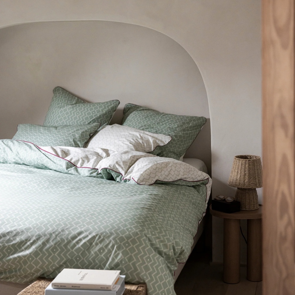 La housse de couette en percale de coton se distingue par son tissage serré et son aspect mat. Résultat : un toucher frais, une excellente tenue dans le temps et une élégance discrète qui s’intègre dans tous les styles de chambre.