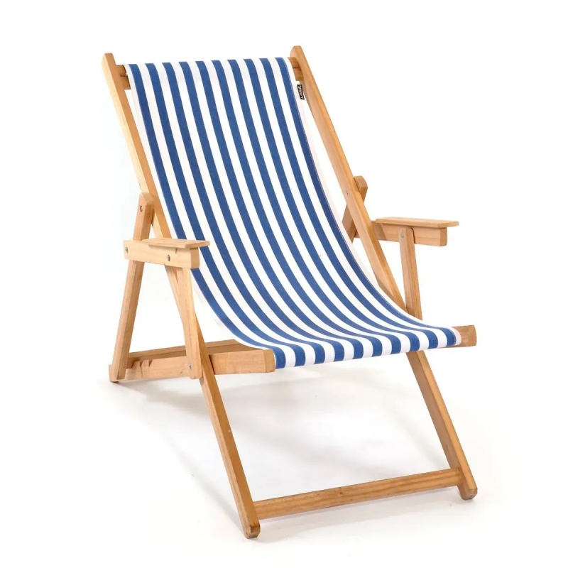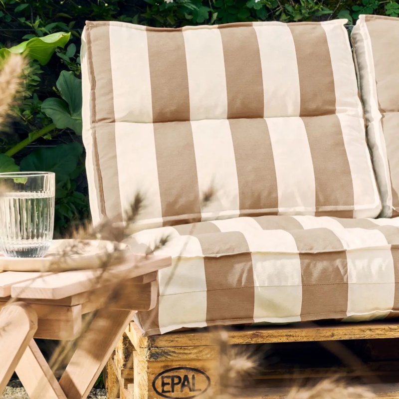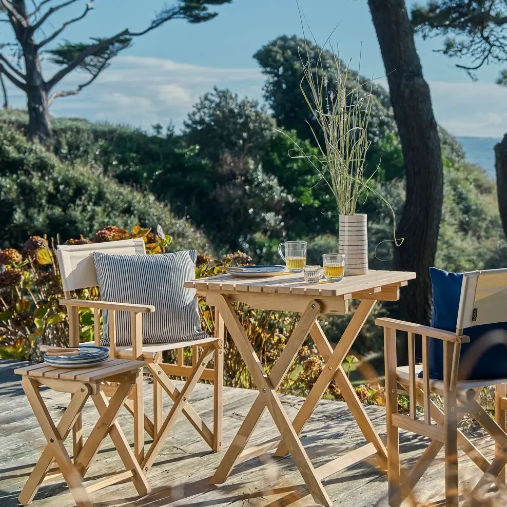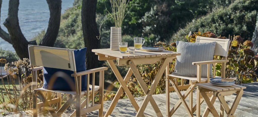 Table et chaises de jardin en bois, textiles à rayures bleu et blanc marins, le style bord de mer chic s’invite sur les terrasses et balcons grâce à la sélection Camif.