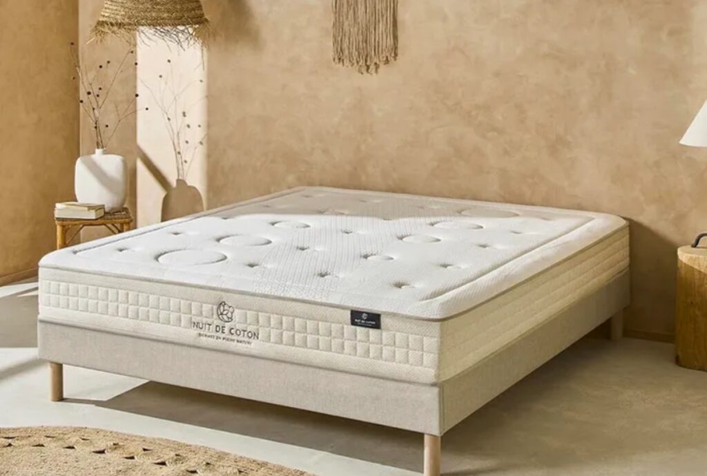 Matelas Latex 100% Naturel Prélude 2.0 160×200 cm Nuit de Coton. Un matelas en latex de qualité avec du latex naturel, du coton organique, de la laine pure. Un choix sain. Source photo : BUT