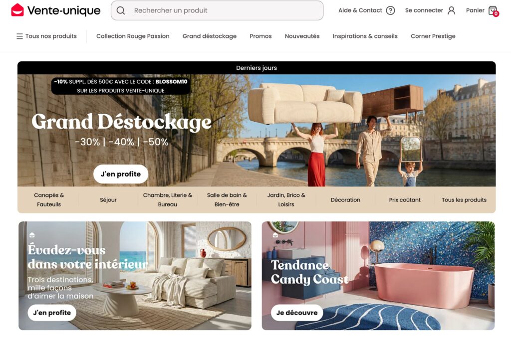 Le printemps est souvent synonyme de renouveau côté déco, et cette année, Vente-unique.com mise sur une opération massive pour séduire les amateurs d’aménagement intérieur. L’enseigne française vient de lancer son « Grand Déstockage », avec des remises pouvant atteindre – 50 % sur une large sélection de meubles et d’équipements pour la maison.