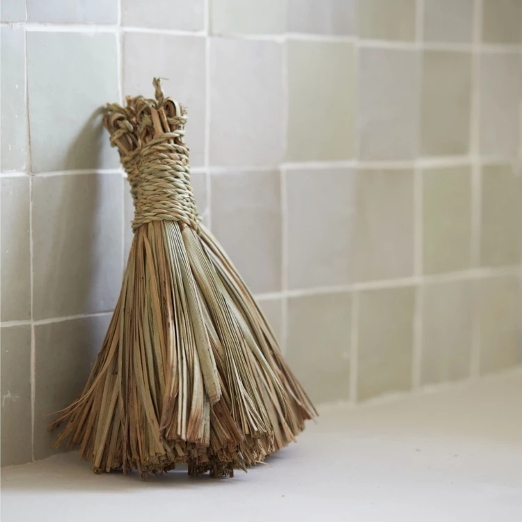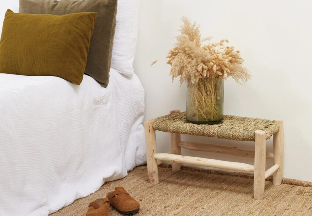 L’une des grandes forces de cette décoration réside dans l’utilisation de matériaux naturels. La feuille de palmier, aussi appelée doum, est omniprésente dans les paniers, malles ou assises. Elle apporte une texture organique qui s’intègre parfaitement dans les intérieurs bohèmes.